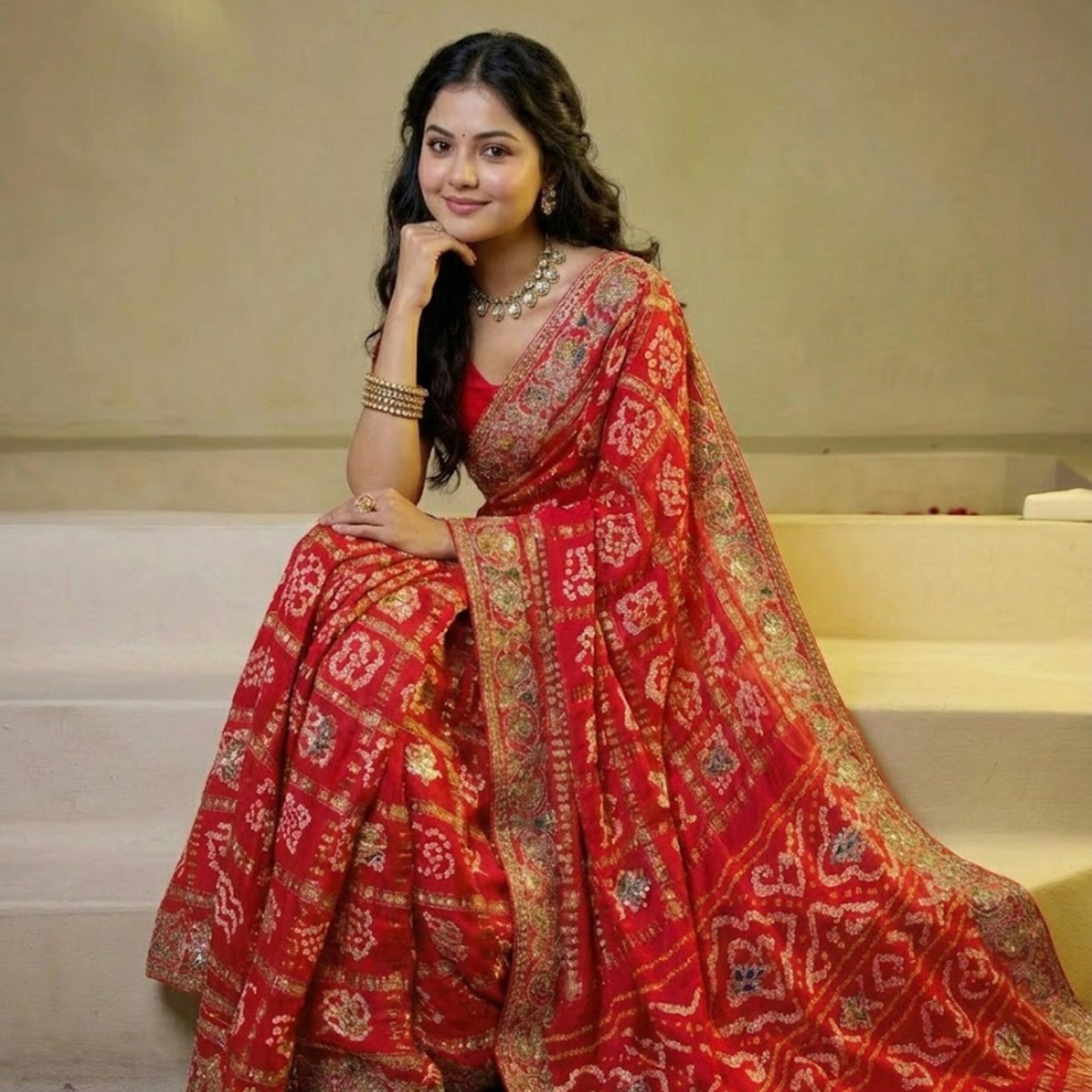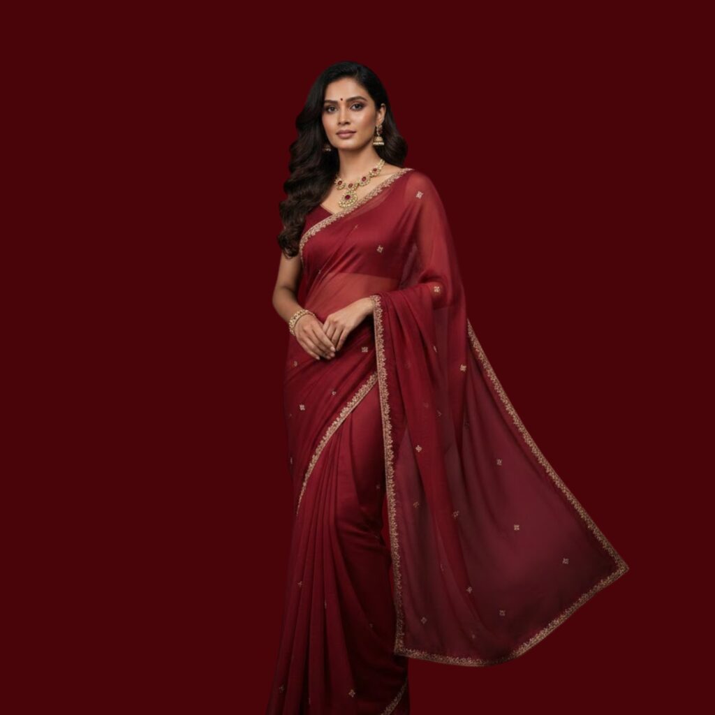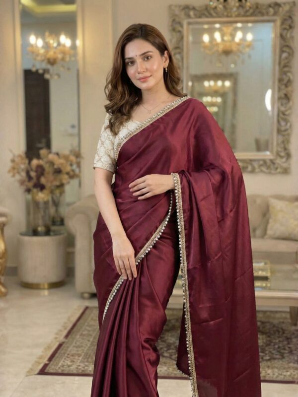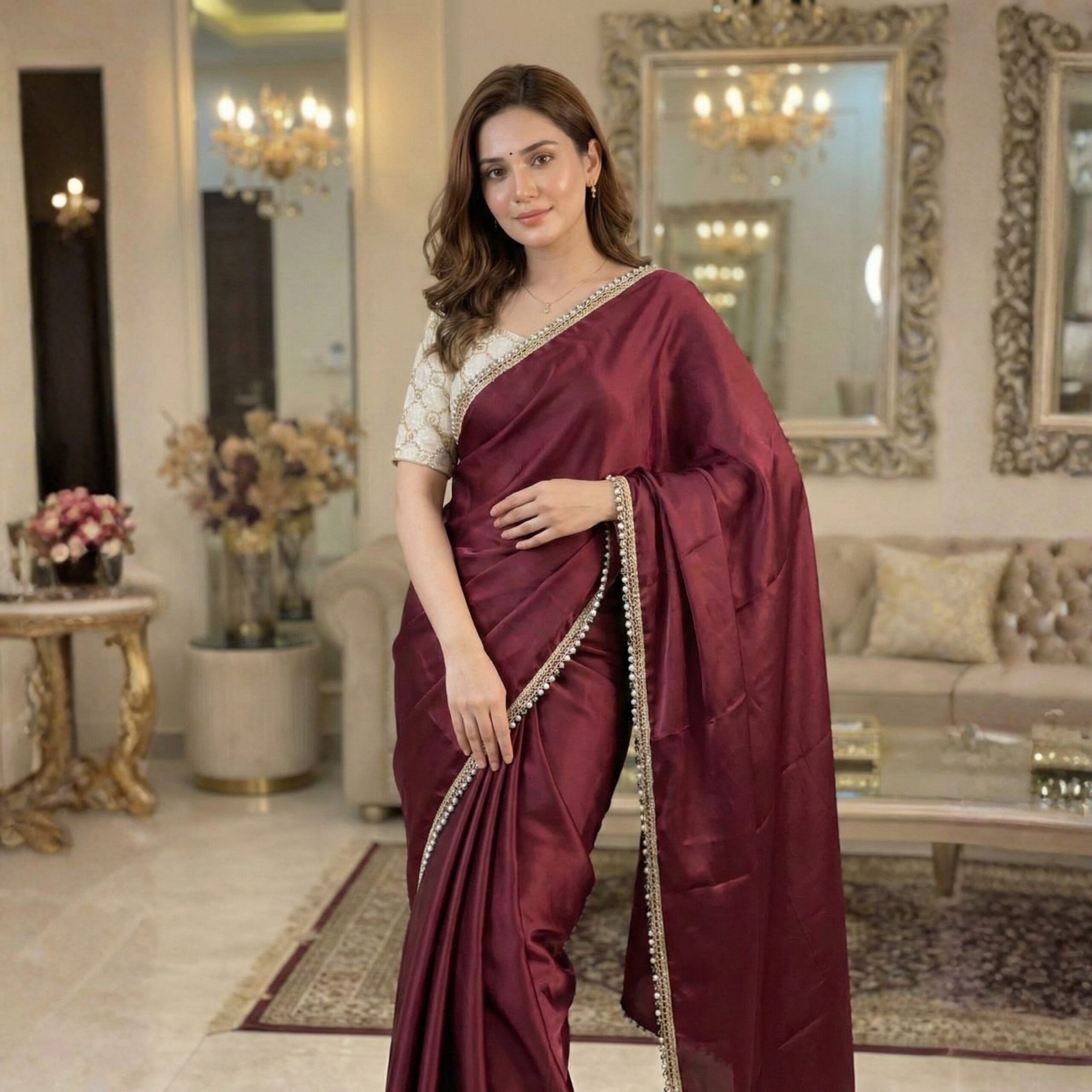 Parvanya Deep Wine Satin Silk Saree with Contrast Pearl-Work Blouse