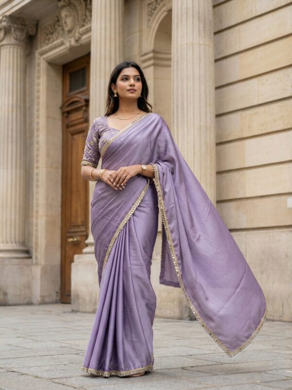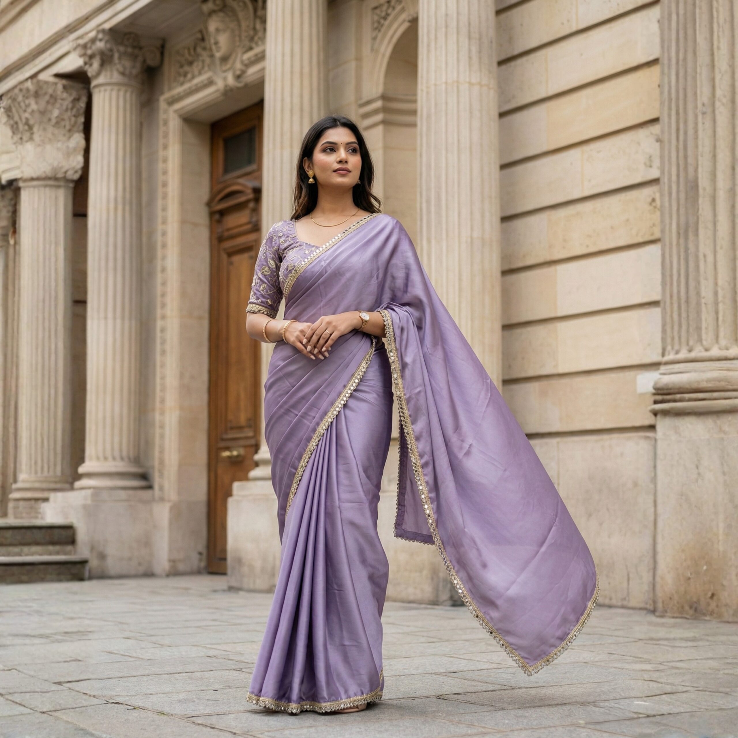 Parvanya Lavender Mist Satin Saree with Intricate Mirror-Lace Border