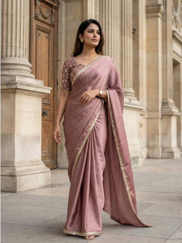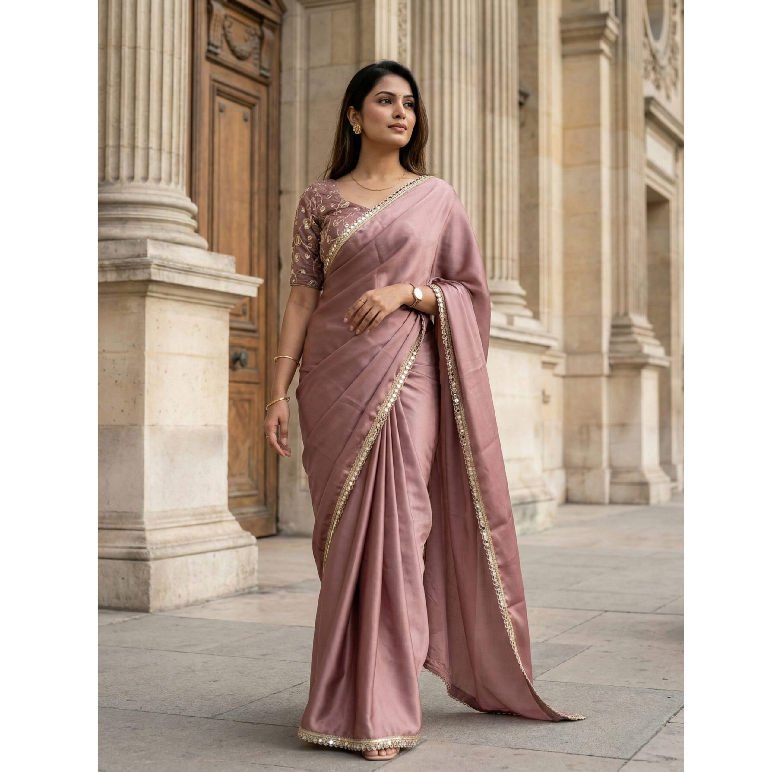 Parvanya Dusty Rose Satin Saree with Mirror-Work Scalloped Border