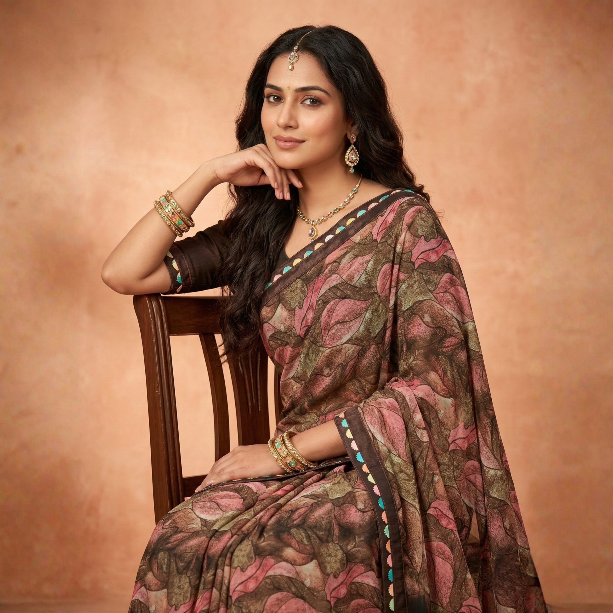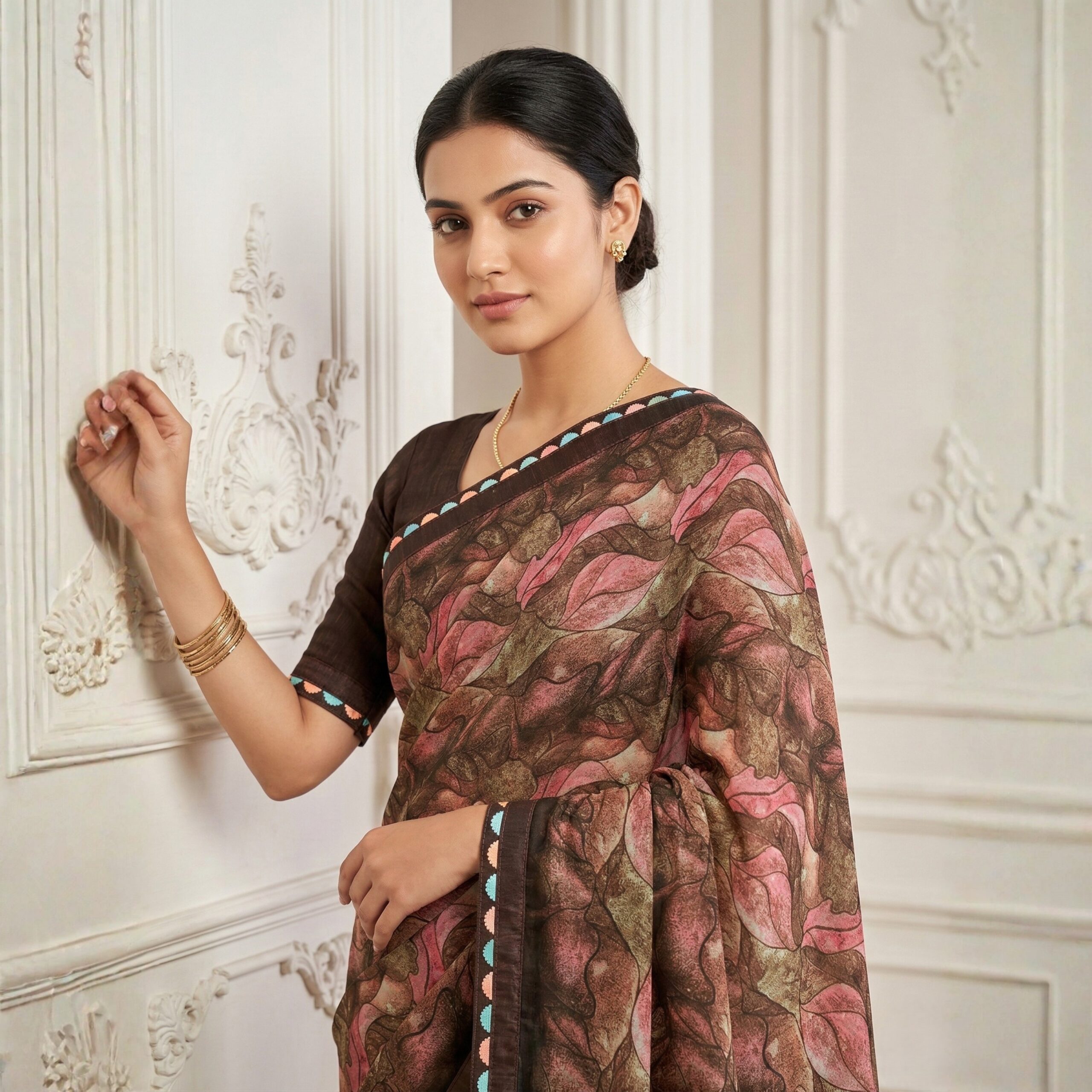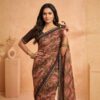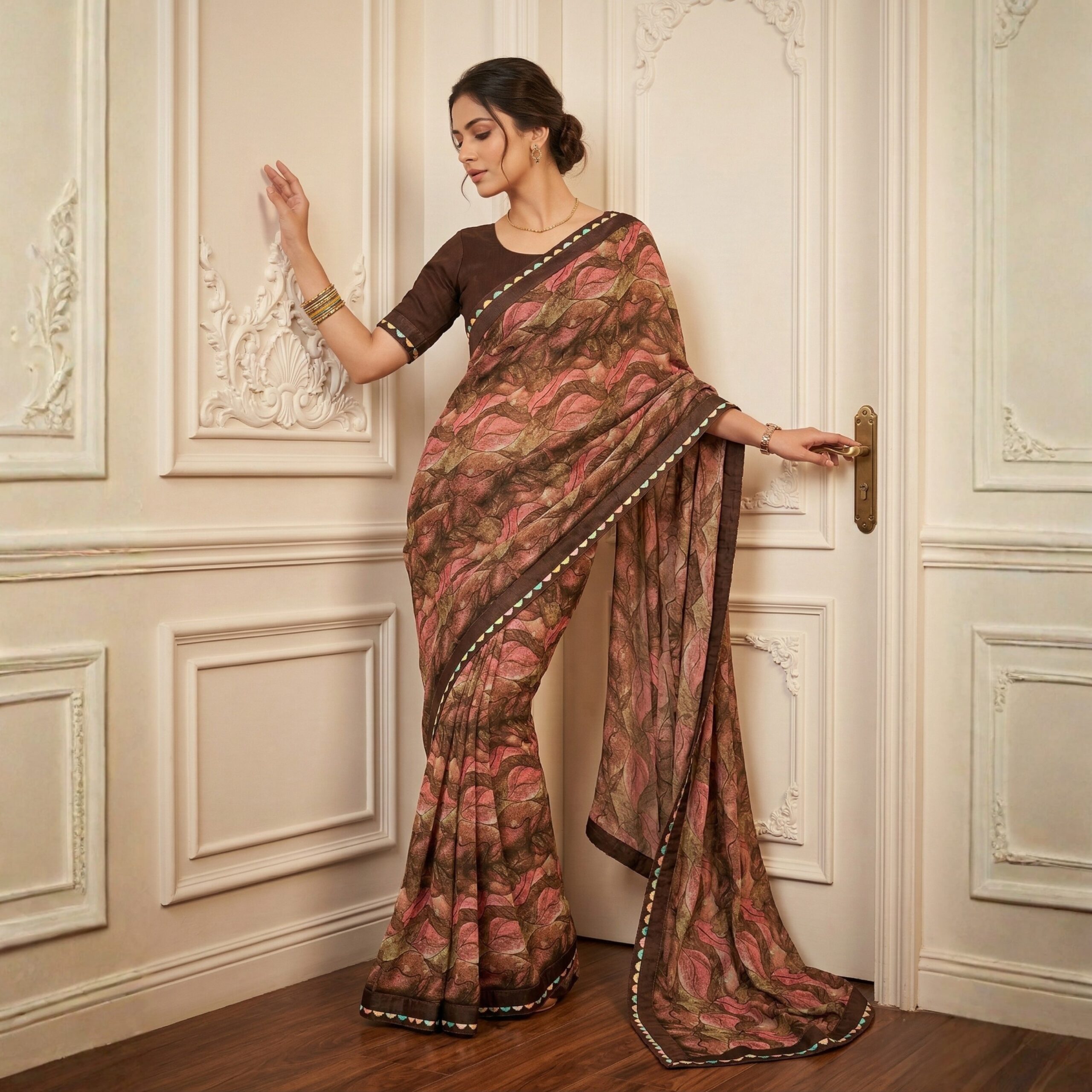 Embrace a graceful, fluid silhouette with this stunning Printed Georgette Saree. Designed for the modern woman who appreciates traditional roots, the saree features an all-over abstract leaf print in a rich palette of coffee brown, dusty rose, and olive green.