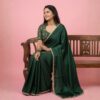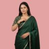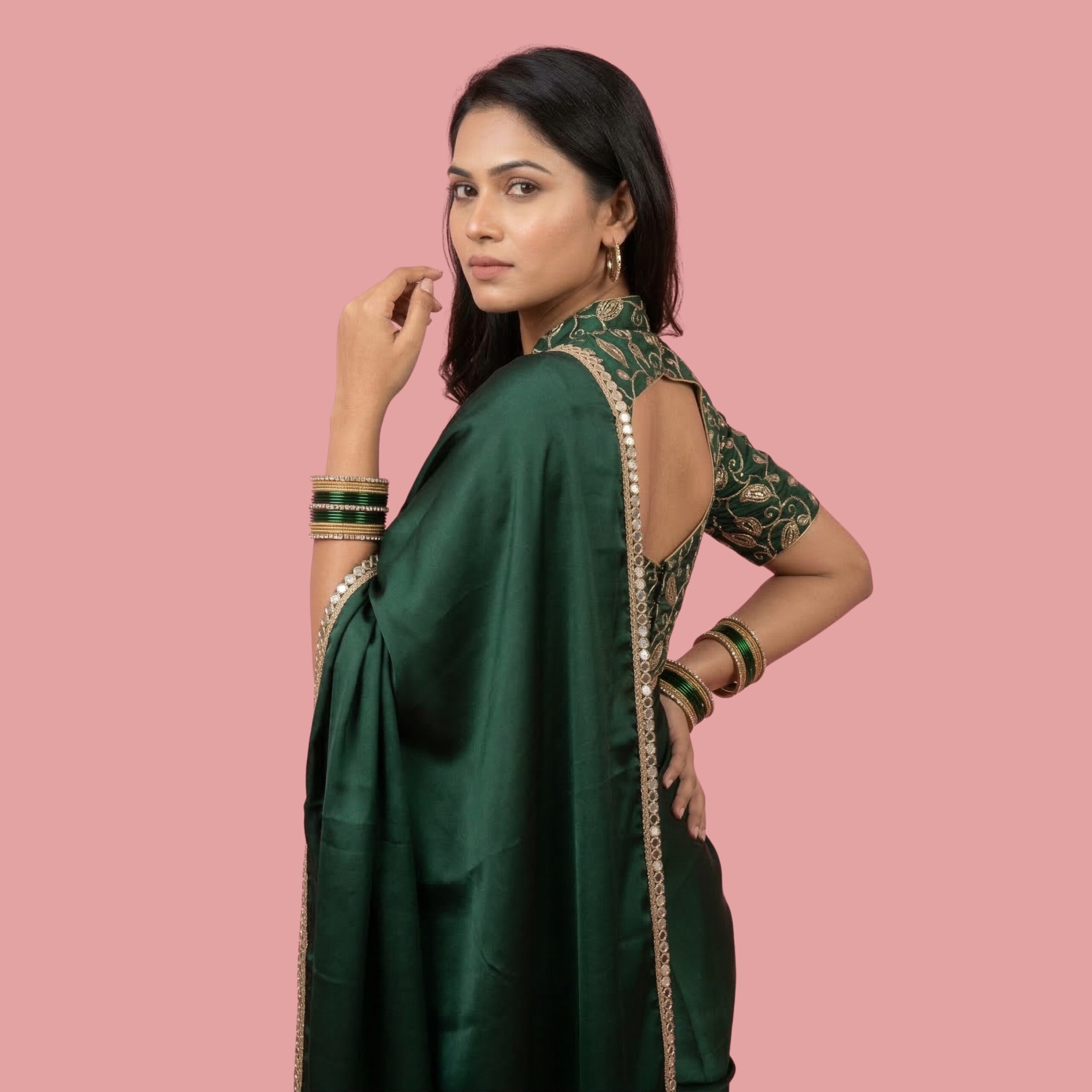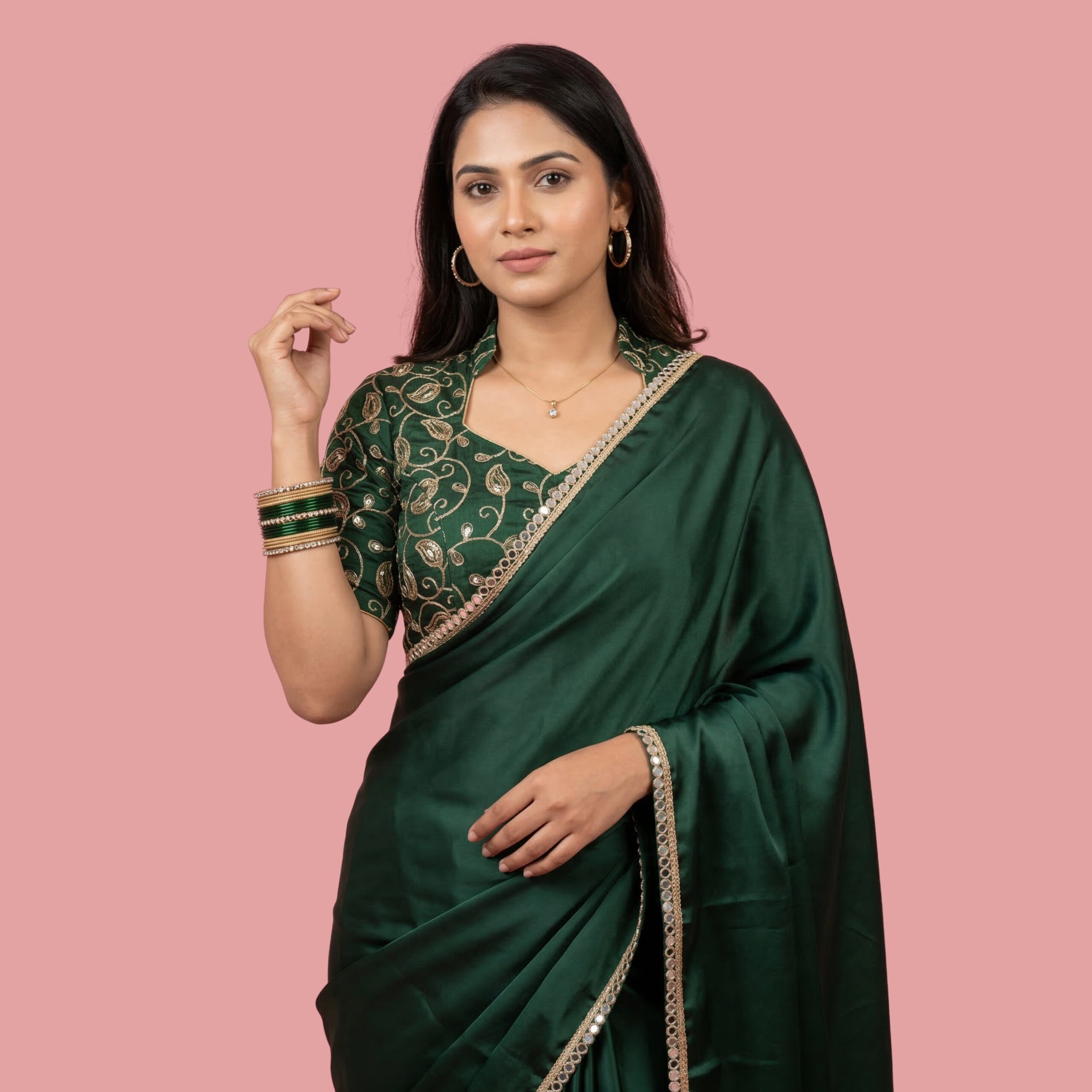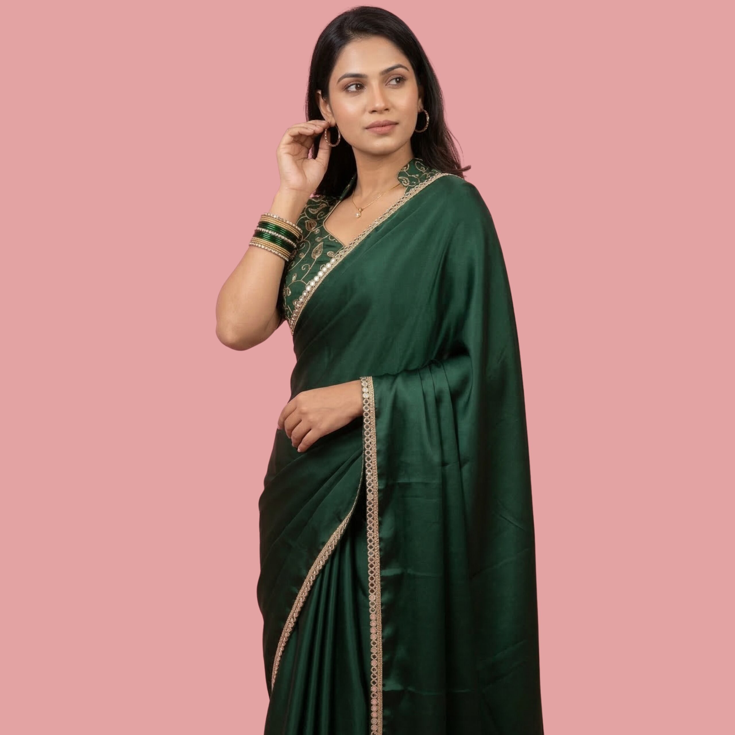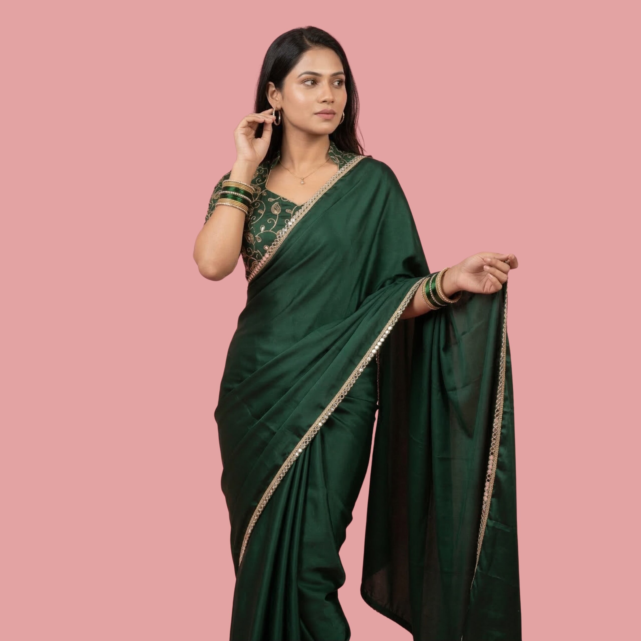 Go bold with the season’s favorite shade. Our Forest Green Satin Saree is all about high-fashion impact with zero effort. The fluid satin fabric catches the light with a soft glow, while the thin mirror lace border provides a clean, modern frame to the drape.