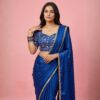 This set features a heavy embroidery-work blouse that serves as a stunning statement piece. Whether you’re attending a festive brunch or a night-time wedding, this saree offers a look that is both fresh and classic.