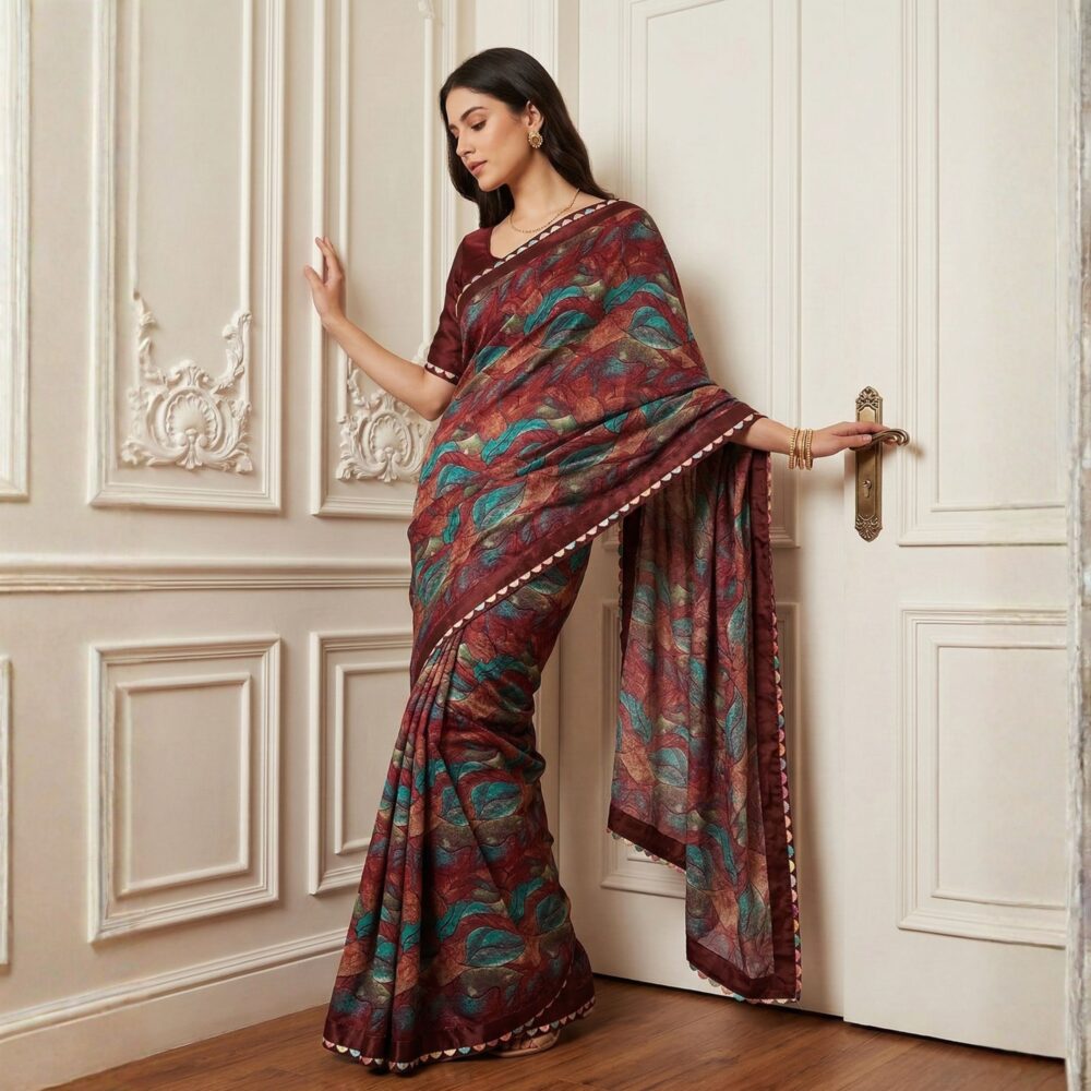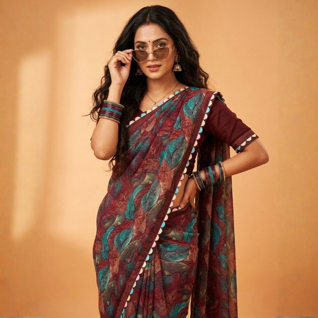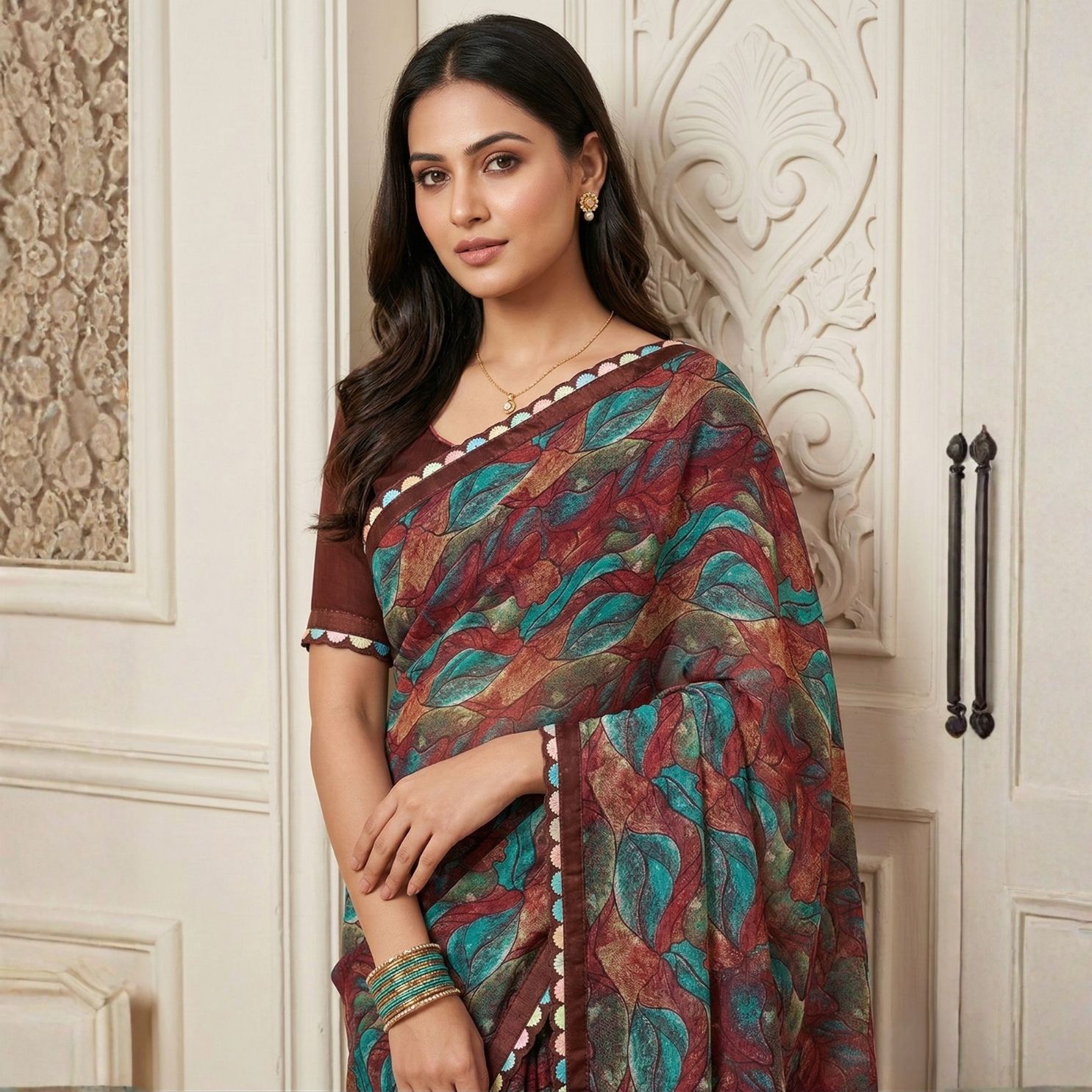 Discover the perfect blend of color and comfort with our Maroon Leaf Print Georgette Saree. This piece is designed for a graceful, flowing silhouette, making it a versatile addition to your ethnic wardrobe. The deep wine base is beautifully contrasted with abstract teal and russet foliage, creating a visually striking mosaic effect.