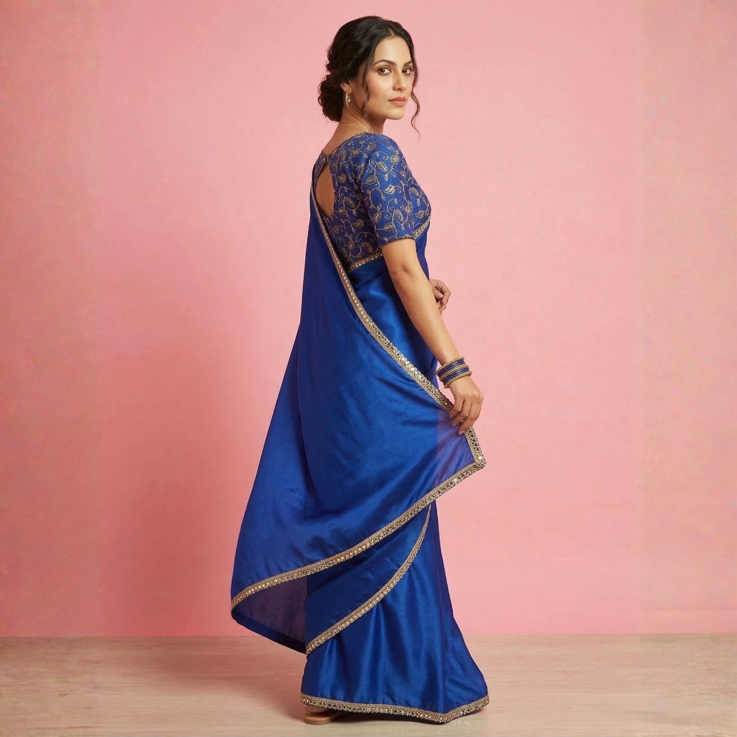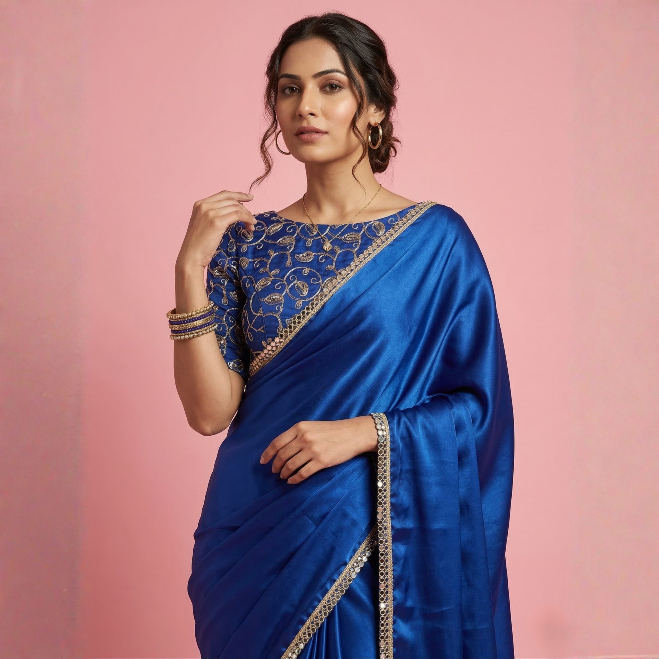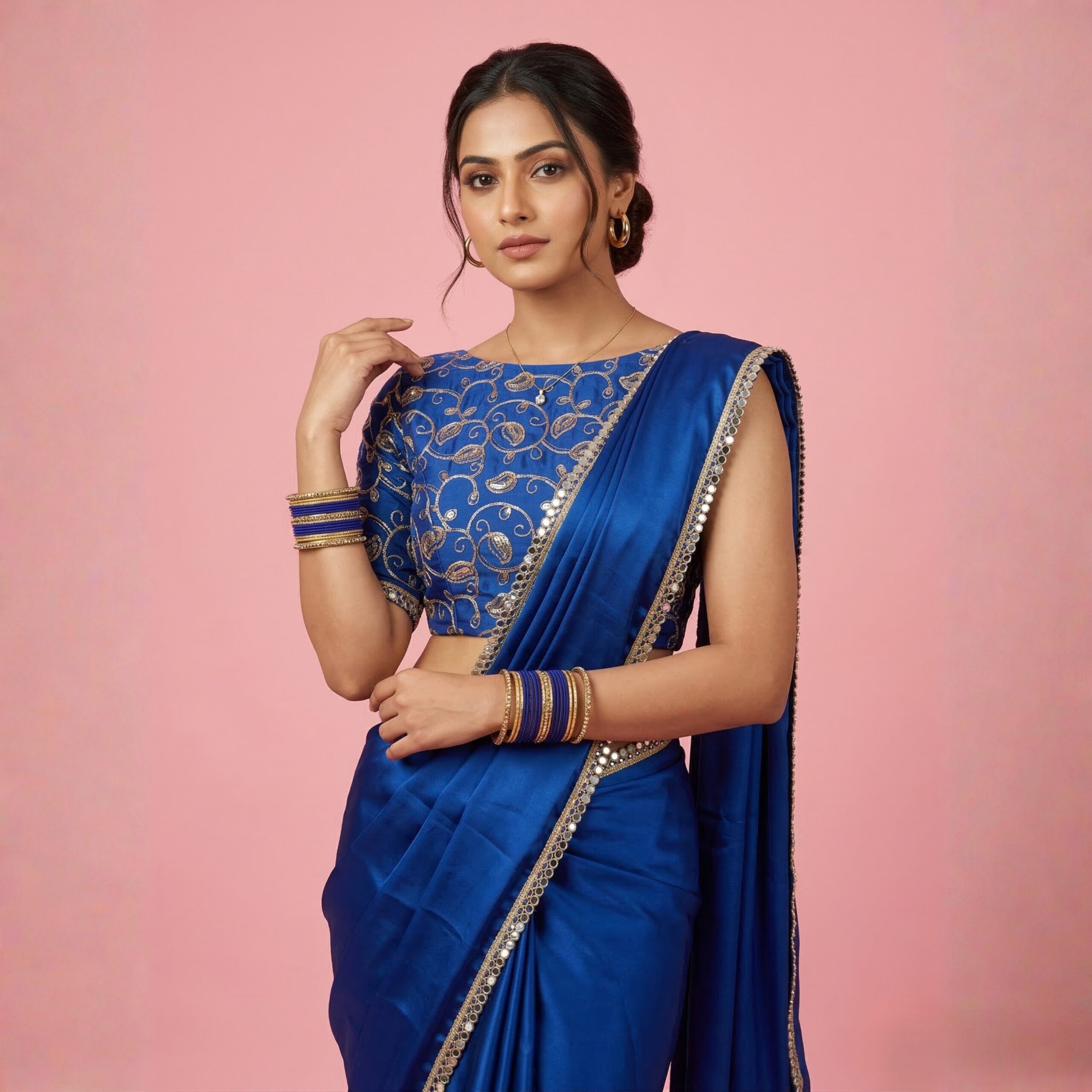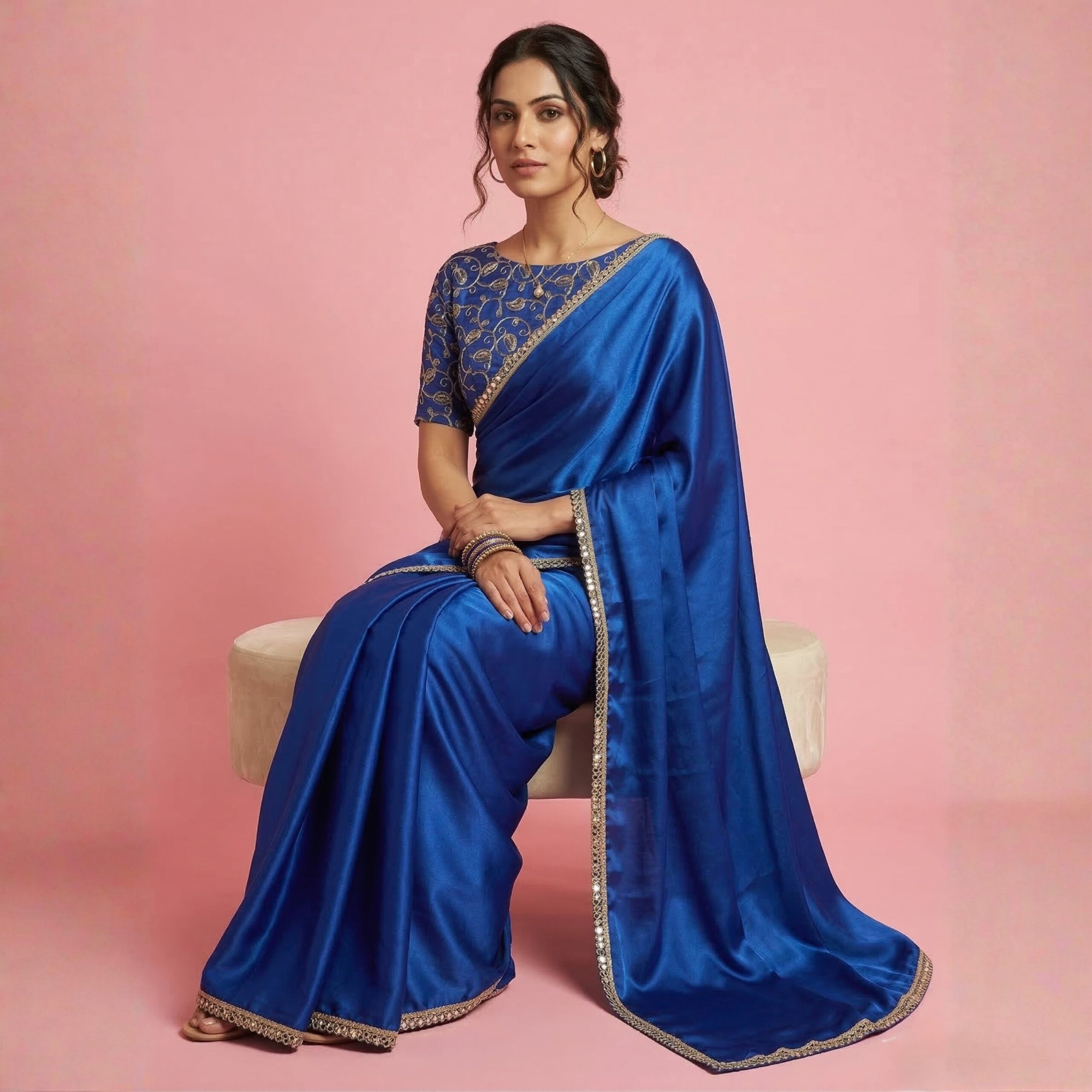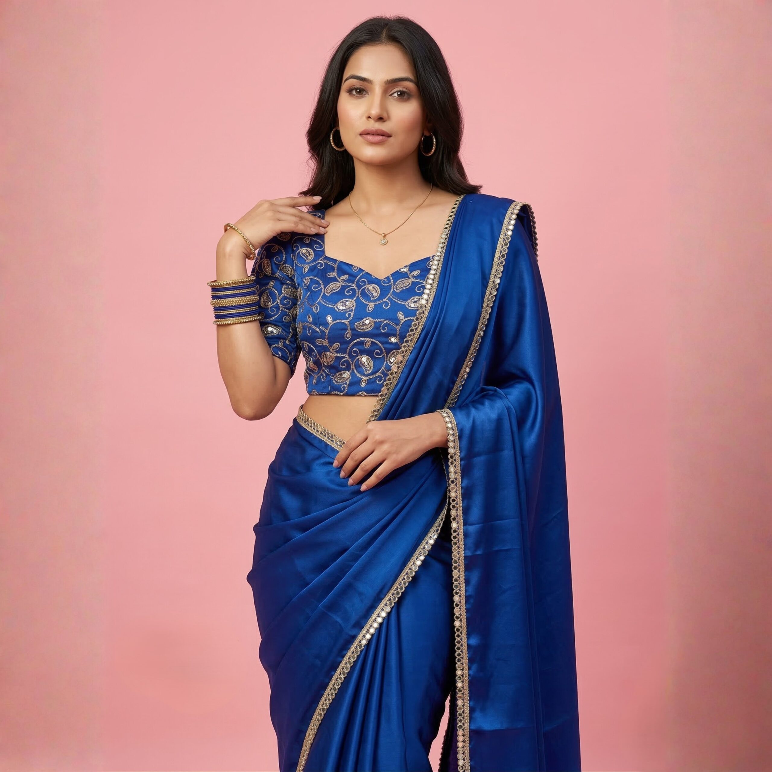 Step into the spotlight with the Electric Blue Satin Saree. Featuring a trending “glass-finish” satin and a shimmering mirror border, this set includes a highly detailed embroidered blouse for a complete, ready-to-celebrate look.